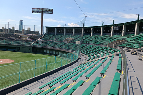 バックネット裏スタンドに1人がけシートを1973席。左右内野席には7~8人掛けのベンチシートを2316席設置しています。外野席は6000人収容。