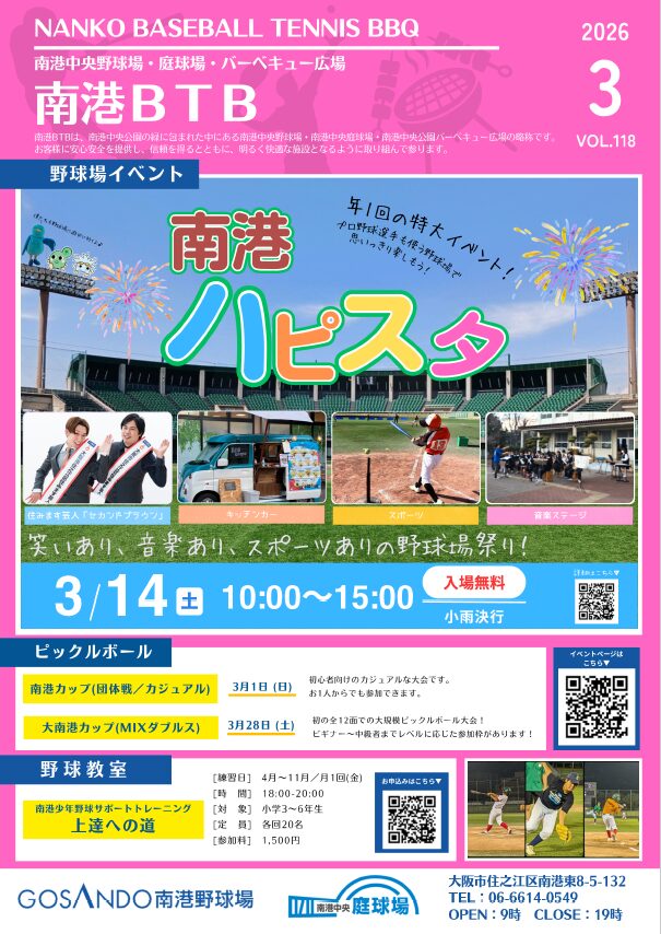 広報紙「南港BTB」は、南港中央野球場・南港中央庭球場・南港中央公園バーベキュー広場の各施設で行われる