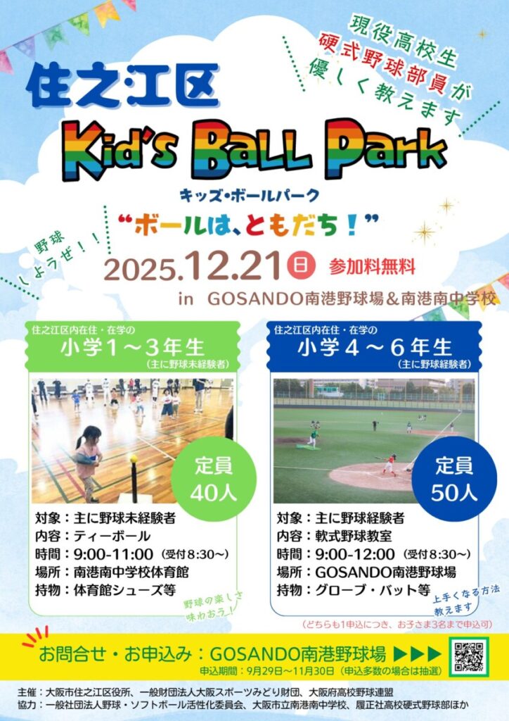 場所 | ①小学1~3年生:南港南中学校体育館 ②小学4~6年生:GOSANDO南港野球場 |
